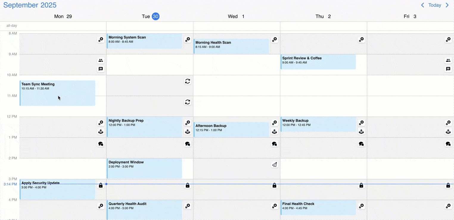 Scheduler cells can display workload markers, icons, or interactive status badges, giving end-users quick visual cues without opening event details.