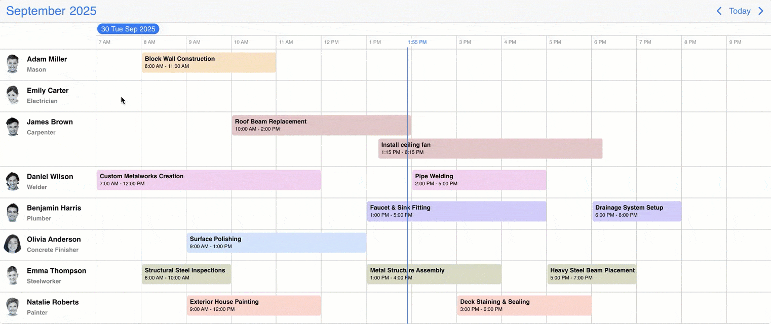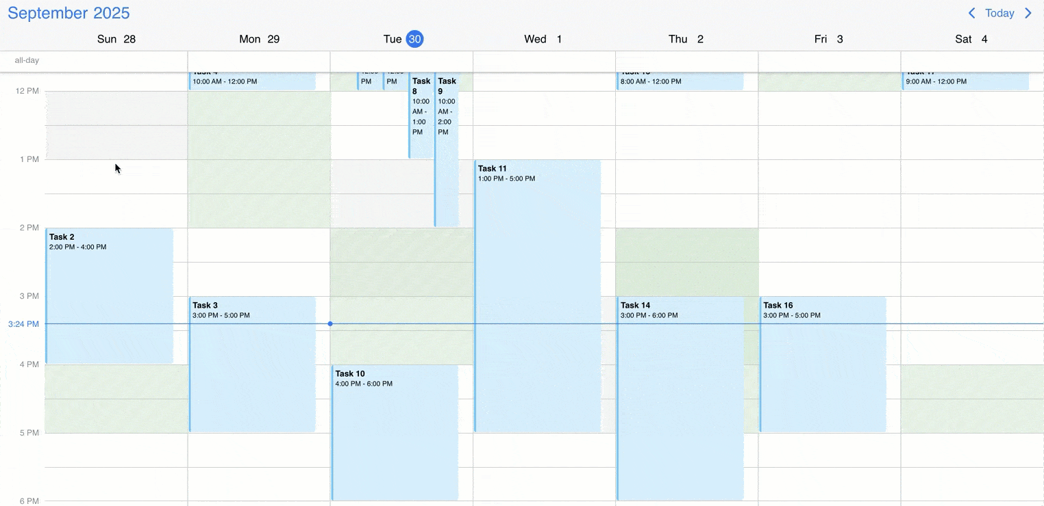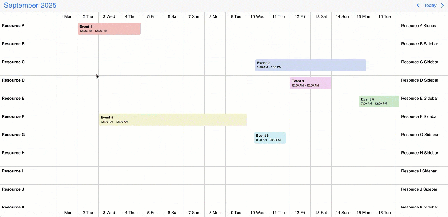 We have built a demo using the Timeline view, utilizing the brand new hover events to dynamically highlight cursor position along with rows and columns, making dense schedules and large grids much easier to navigate. When a user hovers over a cell, the entire row and column light up, so it’s instantly clear where you are in the grid and how that slot connects across time and resources.