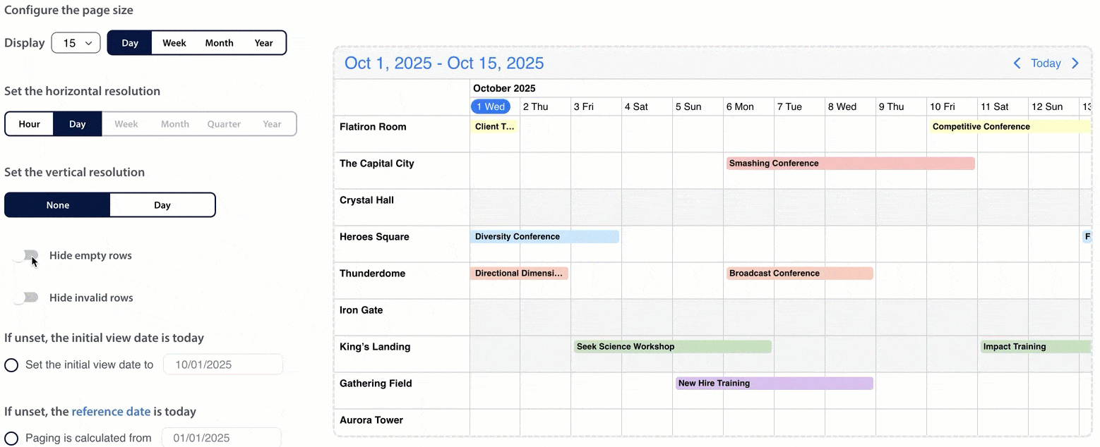 For example, in a hospital doctors appointment planner, empty resource rows for doctors who are off-duty can be hidden, keeping attention on active staff. The result is a denser, more efficient view: less scrolling, less wasted space, and a cleaner presentation for teams and end-users alike.