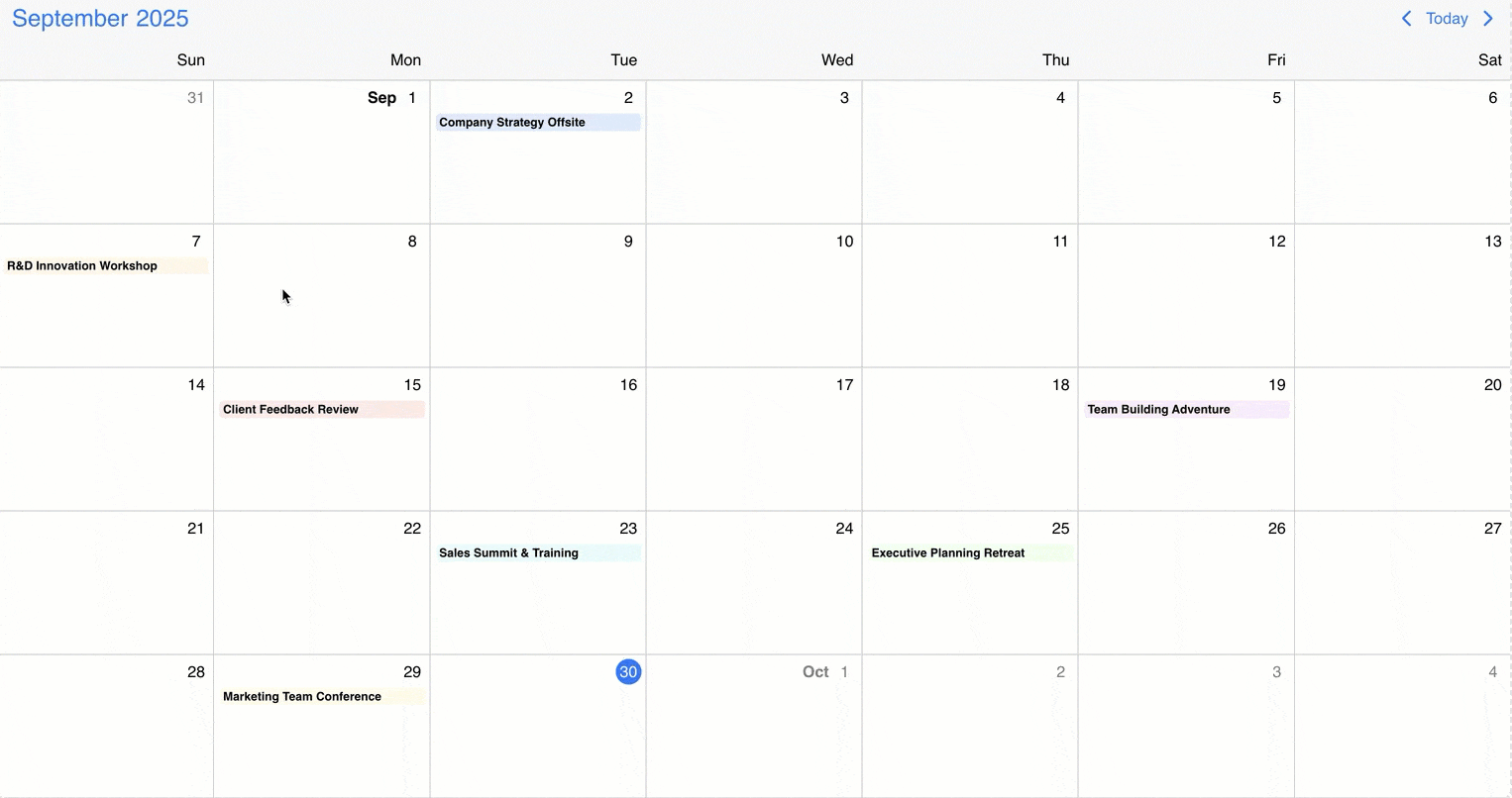 Another demo that we built using the new hover and templating capabilities is for the event calendar. This makes the calendar more intuitive: month cells now display totals – like daily bookings, tasks, or patient visits – and expand into week or day views with a single click. This gives users a clear overview at a glance and quick access to the details they need, without switching tools or views.