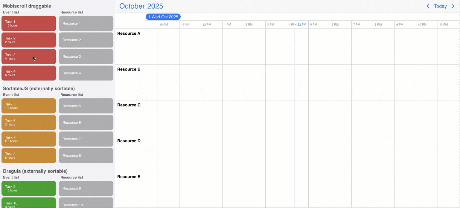 Mobiscroll 5.35 integrates directly with SortableJS and Dragula, allowing events and resources to be dragged between external lists and Event Calendar, Scheduler & Timeline views. For example, pending tasks can be scheduled by dragging them from a backlog into the calendar, or entire resources like drivers or classrooms can be reassigned between timelines.